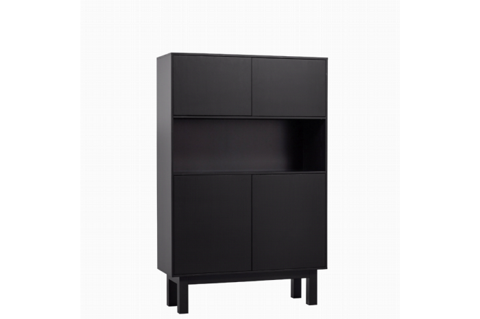 De Finca wandkast heeft zowel bovenin als onderin een dicht gedeelte met 2 deuren. Het onderste dichte gedeelte heeft een extra plank, waardoor er 2 ruime vakken ontstaan. In het midden van de kast is een open gedeelte, waar bijvoorbeeld mooie glazen en karaffen kunnen worden geplaatst. De deuren van de kast kunnen geruisloos worden geopend en gesloten dankzij het luxueuze push-to-open systeem.