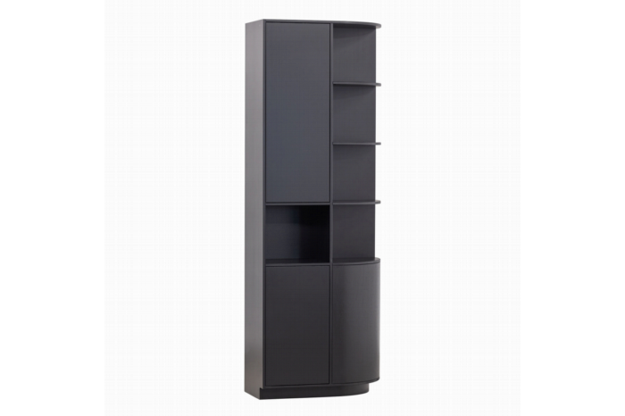 De wandkast Finca heeft bovenin ÉÉn gesloten deel en onderin twee gesloten delen, waarvan ÉÉn deur halfrond is. De deuren hebben een elegante greeploze afwerking en zijn voorzien van een luxe push-to-open systeem. Daarnaast heeft de kast verschillende open gedeeltes waar je boeken of decoratieve woonaccessoires kunt plaatsen.