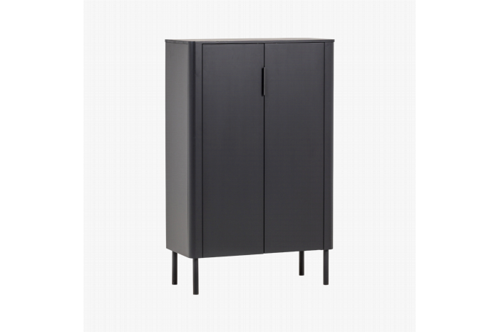 Wandkast Gunnar van woonmerk WOOOD is een strakke, stijlvolle opbergkast. Deze 2-deurs kast heeft afgeronde hoeken en is gemaakt van grenenhout met een matzwarte finish. Het hout heeft een zichtbare nerftekening en dit geeft elke Gunnar kast een eigen, unieke look. Wandkast Gunnar is een moderne opberger met een speelse hoogte, perfect voor een minimalistische woonstijl die wel een eigenzinnige touch kan gebruiken.Indeling:De kast heeft twee planken voor een handige vakverdeling, elk met een maximaal draaggewicht van 15 kg. Bij het bovenste vak is er een uitsparing voor het geleiden van snoeren. De totale hoogte van 135 cm laat ruimte om ook bovenop de kast items te plaatsen, zoals bijvoorbeeld een decoratieve lamp.Levering & montage:Wandkast Gunnar wordt in twee pakketten geleverd en moet nog gemonteerd worden. Dit is eenvoudig zelf te doen aan de hand van de bijgeleverde montagehandleiding. Deze kast wordt liggend gemonteerd. Plaats viltglijders aan de onderzijde van de poten voor het beschermen van harde vloeren.