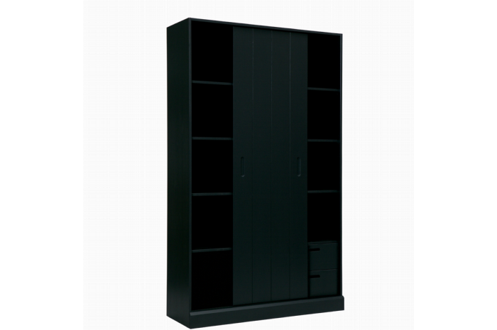 Wandkast Move van interieurmerk WOOOD is een royale kast met trendy uitstraling en lekker veel opbergruimte. Deze kast is gemaakt van massief grenenhout met een geschuurde afwerking. In combinatie met een moderne zwarte kleur zorgt dat voor een robuuste look. Met de schuifdeur bepaal je zelf welk gedeelte van de kast je afsluit, hiermee past wandkast Move perfect in een eigentijds interieur.Indeling:Schuifdeurkast Move heeft een breedte van 120 cm en beschikt over 9 grote opbergvakken en een handige schuifdeur. De schuifdeur is ruimtebesparend en geeft de mogelijkheid om een aantal vakken te verbergen, dat brengt een rustige sfeer in huis. Aan de rechterkant van de kast zitten onderin nog twee lades. Je kunt er zelf voor kiezen of je de schuifdeur voor de lades schuift of juist de lades in het zicht houdtLevering & montage:Wandkast Move wordt als bouwpakket geleverd en moet nog gemonteerd worden. Het is makkelijk te monteren met behulp van de bijgeleverde montage instructie.