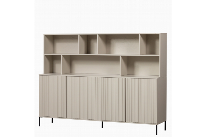 De New Gravure wandkast is een opvallende royale kast met een modern design en fraai accent op de deuren. Deze wandkast biedt een combinatie van open vakken om leuke deco te etaleren en een dicht gedeelte voor opbergen. Het dichte gedeelte heeft deurtjes met reliëf wat voor een sfeervol lijnenspel zorgt. De kast is gemaakt van grenenhout afgewerkt in kleur Dust. De nerven en knoesten zijn nog steeds zichtbaar en deze natuurlijke kenmerken geven karakter aan het meubel. Het zwart metalen onderstel maakt het geheel luchtig en de greige kleur zorgt voor de elegante finishing touch bij wandkast New Gravure.Indeling:Het meubel heeft bovenin open vakken van 31 cm hoog met diverse breedtes. Het dichte gedeelte onderin heeft 4 greeploze deuren van 66 cm hoog met een push-to-open systeem. In dit deel zitten 4 uitneembare legplanken die ook in hoogte verstelbaar zijn, hierdoor ontstaan er 8 vakken. Het interieur van de kast is van beige spaanplaat.Levering & montage:Het New Gravure wandmeubel wordt als bouwpakket geleverd en moet nog gemonteerd worden. Volg de duidelijke montage-instructie voor het beste resultaat. Plaats viltglijders onder de poten voor het beschermen van harde vloeren. Zorg dat de omvalbeveiliging goed is gemonteerd om ongelukken te voorkomen.Ook leverbaar:Van de WOOOD Exclusive New Gravure serie zijn diverse meubelen leverbaar, leuk om met elkaar te combineren. Ook kun je kasten met dezelfde hoogte aan elkaar koppelen voor een extra royaal en luxueus effect. Bij gekoppelde kasten zet je aan de ene kast de poot voor en aan de andere kast de poot achter. Dat geeft een rustig en strak beeld.