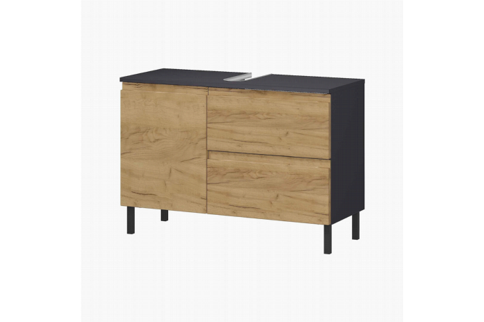 Deze ideale wastafelkast voorziet je in voldoende opbergruimte. Achter de linker deur bevindt zich een verstelbare legplank, aan de rechterkant van het meubel een lade en een klep. Deze sluiten allen zacht en geruisloos door het soft-close systeem. Gepoedercoat metalen pootjes in combinatie met geruisloos sluitende deuren en laden maken dit meubelstuk helemaal af. Geproduceerd in Duitsland, dit staat voor degelijke kwaliteit en een lange levensduur. Gemakkelijk te monteren doormiddel van de meegeleverde montagehandleiding. Bekijk ook de andere elementen uit deze badkamerserie!