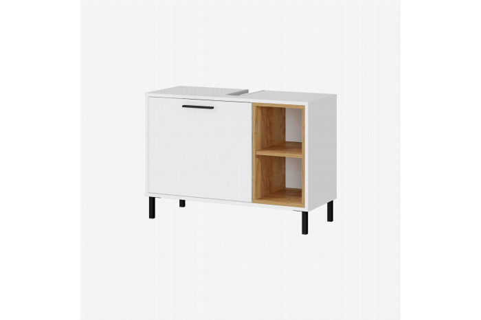 Deze smalle en fijne badkamerkast vindt gemakkelijk zijn plaatsje in jouw badkamer. Het effen wit gecombineerd met eiken geeft deze kast een warme uitstraling. De gepoedercoate zwart metalen pootjes in combinatie met het handvat accentueert de kast mooi. Voldoende opbergruimte voor al je badkamerbenodigdheden. De randen van de kast zijn afgewerkt met ABS-kantafwerking waardoor deze tegen een stootje kunnen, de deuren sluiten geruisloos. Geproduceerd in Duitsland wat staat voor goede kwaliteit met een lange levensduur. Gemakkelijk te monteren doormiddel van de bijgeleverde montagehandleiding. Leuk te combineren met de andere meubelen uit deze serie.