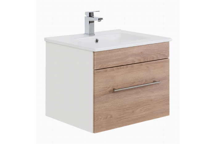 Deze wastafelkast heeft een breedte van 59cm, een hoogte 48cm en een diepte van 45,5cm. De wasbak met overloop heeft een breedte van 61,5cm en een diepte van 46,5cm. Onder de wastafel bevindt zich een ruime lade met soft-close systeem.De wastafelkast wordt geleverd exclusief kraan, toevoerleidingen naar de kraan, afvoerplug en zwanenhals. De wastafelkast is verkrijgbaar in 3 afmetingen Small, Medium en Large en kan worden uitgevoerd in hoogglans wit, zwart, antraciet, beton-look en eiken.