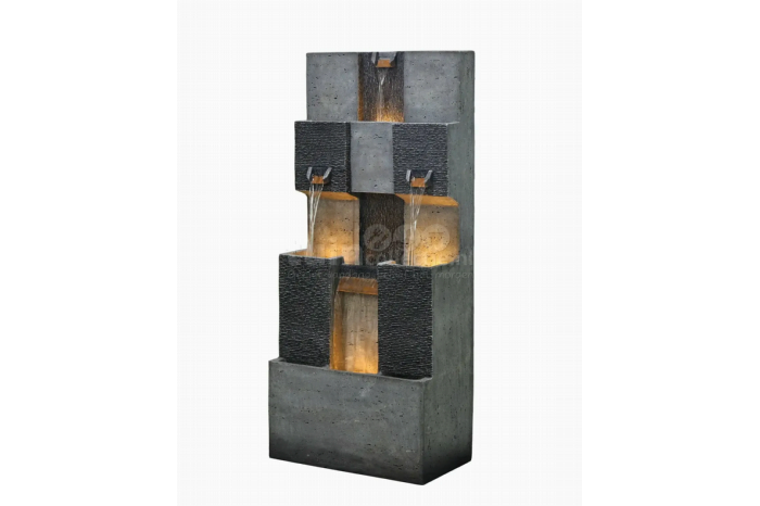 Waterornament Sidney 115cmCreëer rust en sfeer met een waterornament in de tuin, op het terras of op het balkon. Waterornament Sidney is een modern vormgegeven ornament dat meteen gebruiksklaar is door het 'Plug&Play' principe. De terrasfontein is gemaakt van polystone, met de uitstraling van ruw en glad graniet. Daarbij bestaat hij uit trapsgewijze vorm met vier watervallen. Alle vier de watervallen zijn voorzien van een sfeervol LED-lampje die samen in de avonduren oplichten in het kabbelende water. Het water stroomt van de bovenste waterval naar de twee middelste en van de vierde in de onderste bak. Het water uit het reservoir wordt zo constant rondgepompt. Dit waterornament voor in de tuin is 51cm lang, 28cm breed en 115cm hoog.Gebruik waterornament - Plug&PlayWaterornament Sidney is een compleet waterornament, inclusief pomp, LED verlichting en toebehoren en is na het plaatsen vlug klaar voor gebruik. Plaats het waterornament op een vlakke, stabiele ondergrond en vul het reservoir via de achterzijde van het ornament met water. Plaats eenvoudig het pompje in het reservoir, steek de stekkers in het stopcontact en het genieten kan beginnen!Onderhoud waterornamentOm zo lang mogelijk van het waterornament te genieten, raden we aan om het reservoir geregeld bij te vullen, zodat het waterpeil op orde blijft en de pomp optimaal blijft werken. Na het seizoen de pomp en slangen afspoelen, het reservoir leegmaken en het ornament op een droge plek neerzetten. Kalkafzetting en vergrijzing van de laklaag behoren tot de normale gebruikssporen.Specificaties Hoogte: 115cm Lengte: 51cm Diepte: 28cm Kleur: Grijs Materiaal: Polystone (harde kunststof) Verlichting: Ja, 4x 6-LED Werkt op een transformator - low voltage Complete set inclusief: Ornament, LED verlichting en pomp