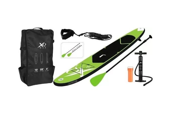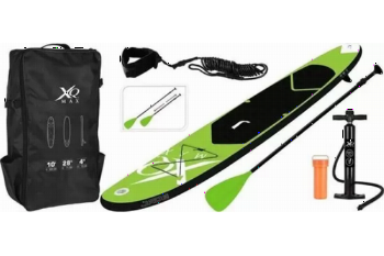 Supboard Set 305 XQMAX Lime GroenDeze supboard set is perfect voor zowel de beginner als de meer ervaren sup-surfer. Suppen staat ook wel voor 'Stand Up Paddle', waarbij je je staand met een paddle op een surfboard voortbeweegt op een meer, gracht, zee of ander water. Dit grote, opblaasbare supboard is lime groen van kleur en voorzien van diverse accessoires. Zo is het board eenvoudig op te pompen met de grote handpomp en zit er o.a. een paddle bij, afneembare vin en een surfkoord. Na het suppen is het eenvoudig om het board leeg te laten lopen en is hij te vervoeren in de speciale bijgeleverde tas. De aluminium paddle is uitschuifbaar van 170-210cm. Daarnaast is het supboard voorzien van een rubberen anti-slip laag, waardoor je stevig blijft staan.Inhoud sup-set- Opblaasbaar Supboard- Aluminium Paddle - Grote handpomp met PSI-meter- Afneembare vin- Surf-leash (koord)- Reparatiekit- Rugzak- GebruiksaanwijzingSpecificaties- Lengte: 305cm- Breedte: 71cm- Dikte: 10cm- Lengte paddle: 170-210cm- Kleur: Lime Groen- Maximaal belastbaar gewicht: 100 kg- Gewicht: 11kg- Model: 8DP000360